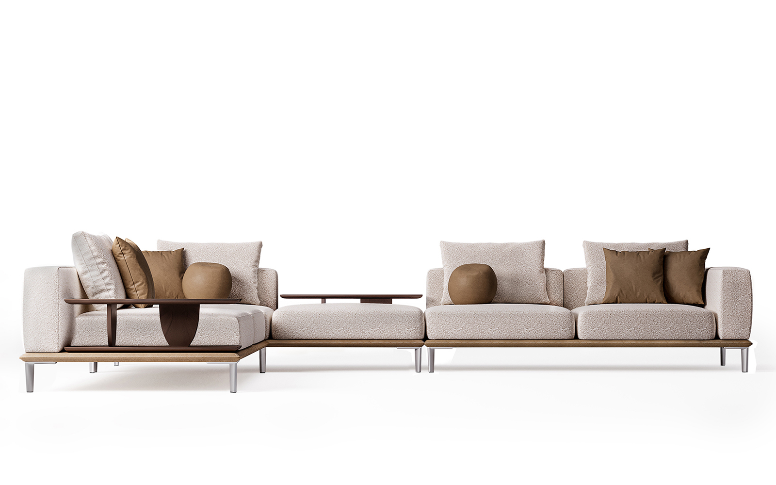 It hovers above the floor with its elegant feet, incorporates upholstered wooden tables, and is divided into different design modules. All this results in a brilliant combination that is able to suit any space, the limit being, your imagination.
